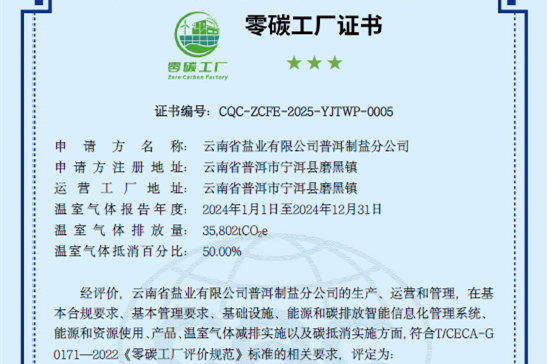 普洱制鹽榮膺全國鹽行業(yè)首個(gè)“零碳工廠”認(rèn)證,樹立綠色轉(zhuǎn)型標(biāo)桿